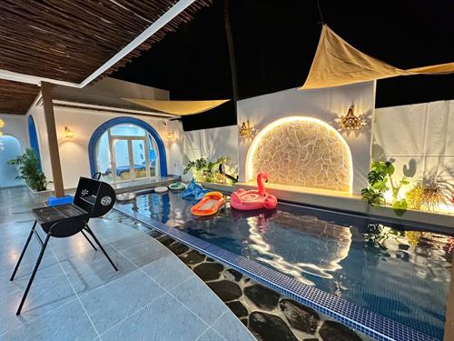 A 5-bedroom villa with 7 king beds. Mediterranean style, sea view. Located in the bustling center. The villa is equipped with a bbq oven, billiard table, karaoke speakers, and a campus of more than 1000 m2. The villa has a swimming pool, living room, tables and chairs, and full kitchen utensils.